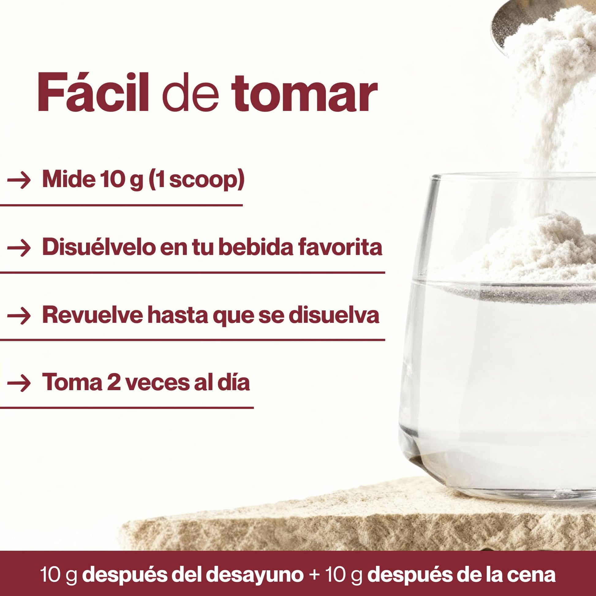 Puedes disolverlo en agua, jugo, café o tu bebida favorita, y cada bolsa rinde aproximadamente 30 días con la dosis recomendada.